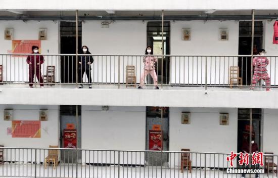 29日中午,作為康復期患者隔離點的武漢軟件工程職業(yè)學院5棟宿舍樓響起了音樂,人們戴上口罩走出房門,站在“口”字型走廊上練起八段錦和太極拳。