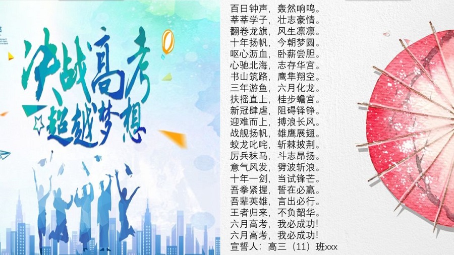 高三學(xué)生劉晨曦:“下午4點到4點50分,我們利用班會課開展了誓師大會,由于技術(shù)的原因,我們是通過放PPT視頻以及開語音的方式來開展的。(環(huán)節(jié))最開始是我們班主任講話?!?/p>