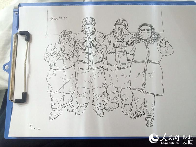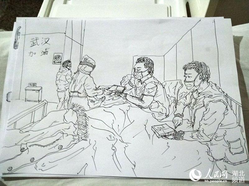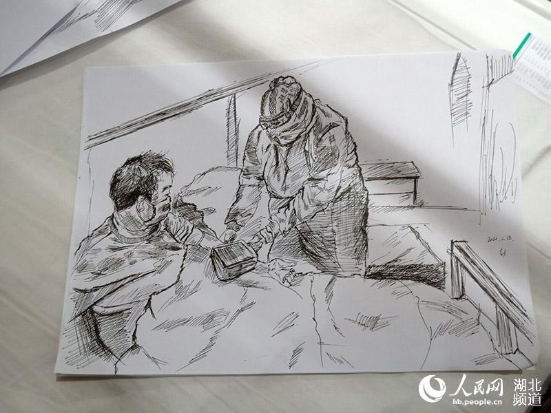 “被照顧得很好”的小彭常??吹结t(yī)護(hù)人員們穿著厚重的防護(hù)服,一忙就是6個(gè)小時(shí)以上不停歇,連水和飯都得換班以后吃,卻每天依然為患者提供無(wú)微不至的照顧。出于感動(dòng)和感激,彭昕燁向醫(yī)護(hù)人員借了紙和筆,將方艙醫(yī)院溫暖的瞬間畫(huà)成素描。