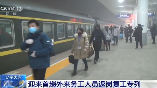 29日凌晨1時05分,由黑龍江省訥河開往遼寧大連莊河的K4082次務(wù)工人員返崗復工專列順利到達莊河北站。這是遼寧大連迎來的首趟外來務(wù)工人員返崗復工專列,521名務(wù)工人員分別來自黑龍江訥河、齊齊哈爾等列沿線的兩省六市。