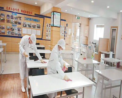 樂(lè)星汽車(chē)電子(青島)有限公司人員在對(duì)餐廳進(jìn)行嚴(yán)格消毒。王 洪攝
