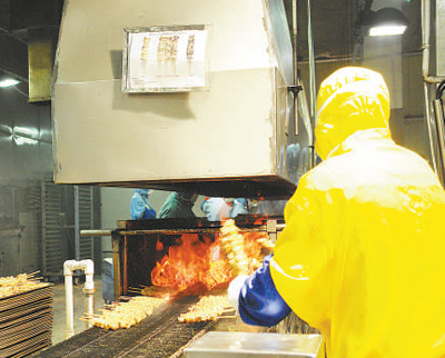 測(cè)體溫、登記、換服裝、消毒,走進(jìn)沈陽(yáng)華美食品有限公司的熟食加工車(chē)間,只見(jiàn)已經(jīng)啟動(dòng)的3條生產(chǎn)線(xiàn)正有條不紊運(yùn)行,300多名工人忙著給雞肉穿串、炭烤、蒸煮、速凍、包裝……一袋袋熟食“新鮮出爐”,被送入冷庫(kù)。