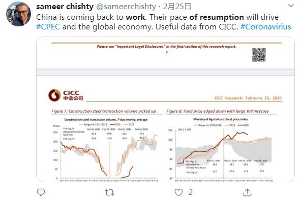 推特用戶sameer chishty說:中國正在復(fù)工復(fù)產(chǎn)。他們的這一步伐將驅(qū)動(dòng)全球經(jīng)濟(jì)增長。