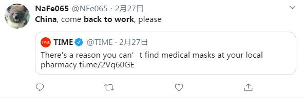 推特用戶NaFe065說:中國趕緊復(fù)工復(fù)產(chǎn)吧,拜托了。