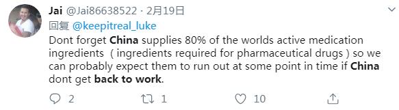 推特用戶Jai說:不要忘了中國供應(yīng)著全世界80%的活性藥物成分,因此如果中國不復(fù)工復(fù)產(chǎn),它們可能會(huì)在某個(gè)時(shí)間點(diǎn)用完。