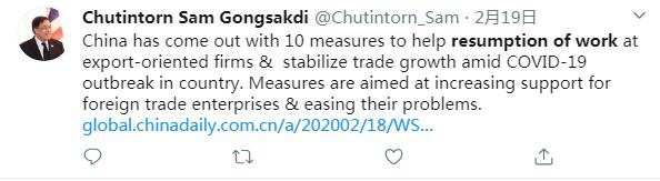 推特用戶Chutintorn Sam Gongsakdi說:在應(yīng)對(duì)新冠肺炎疫情期間,中國出臺(tái)了10項(xiàng)措施來幫助出口企業(yè)復(fù)工復(fù)產(chǎn),并推動(dòng)貿(mào)易的穩(wěn)定增長。這些措施旨在加強(qiáng)對(duì)外貿(mào)企業(yè)的支持,并解決它們面臨的問題。