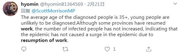推特用戶hyomin說,一些省份已經(jīng)復(fù)工,不過受感染的人數(shù)沒有隨之增加,這表明復(fù)工復(fù)產(chǎn)沒有導(dǎo)致更多感染病例。