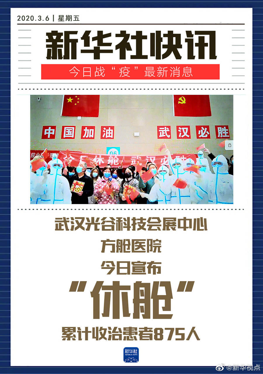 3月6日,武漢光谷科技會展中心方艙醫(yī)院宣布“休艙”。2月17日,該方艙醫(yī)院正式開始收治患者,累計收治患者875人。