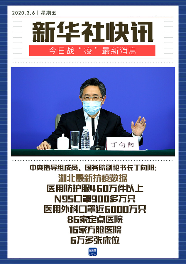 國務(wù)院新聞辦公室3月6日在湖北武漢舉行新聞發(fā)布會,請中央指導(dǎo)組成員、國務(wù)院副秘書長丁向陽,中央指導(dǎo)組成員、工業(yè)和信息化部副部長王江平,中央指導(dǎo)組成員、國家衛(wèi)生健康委黨組成員、中醫(yī)藥局黨組書記余艷紅介紹新冠肺炎疫情防控救治進展情況,并答記者問。