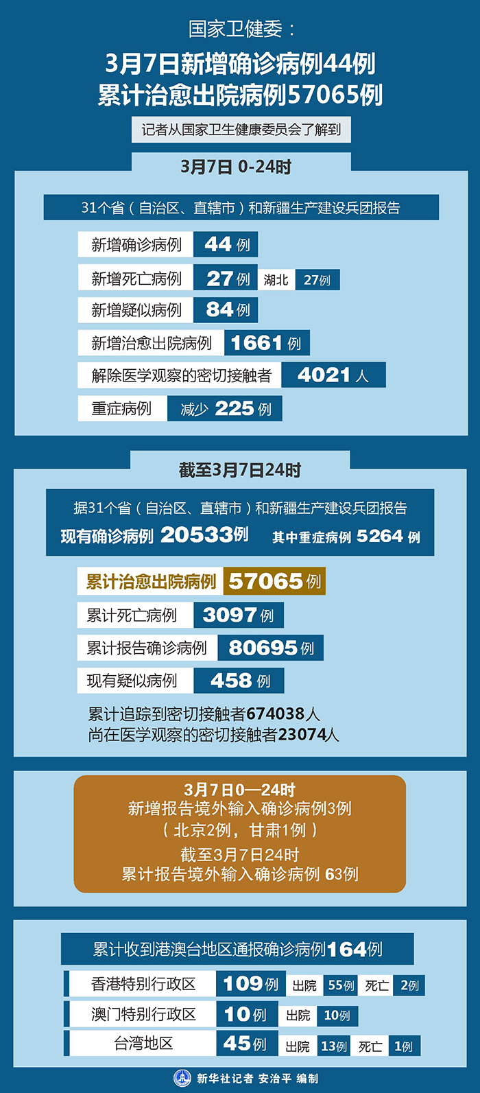 截至3月7日24時(shí),據(jù)31個(gè)?。ㄗ灾螀^(qū)、直轄市)和新疆生產(chǎn)建設(shè)兵團(tuán)報(bào)告,現(xiàn)有確診病例20533例(其中重癥病例5264例),累計(jì)治愈出院病例57065例,累計(jì)死亡病例3097例,累計(jì)報(bào)告確診病例80695例,現(xiàn)有疑似病例458例。累計(jì)追蹤到密切接觸者674038人,尚在醫(yī)學(xué)觀察的密切接觸者23074人。
