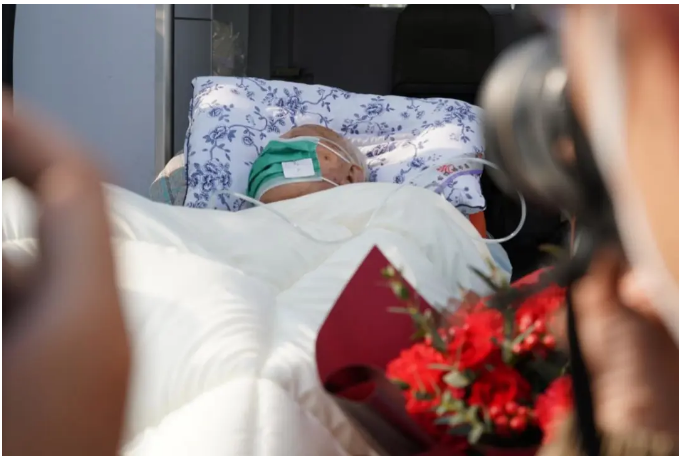7日下午4點左右,辦理好出院手續(xù)后,醫(yī)護人員用醫(yī)用平車將100周歲的治愈患者王大爺推到醫(yī)院門口,抬上轉(zhuǎn)運車輛。
