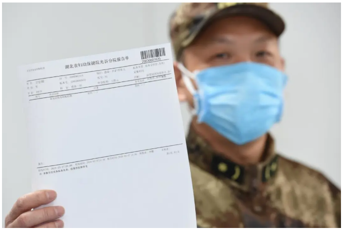醫(yī)務人員向記者展示老人的新冠病毒核酸檢測陰性報告單 攝影:趙佳慶