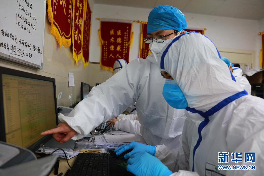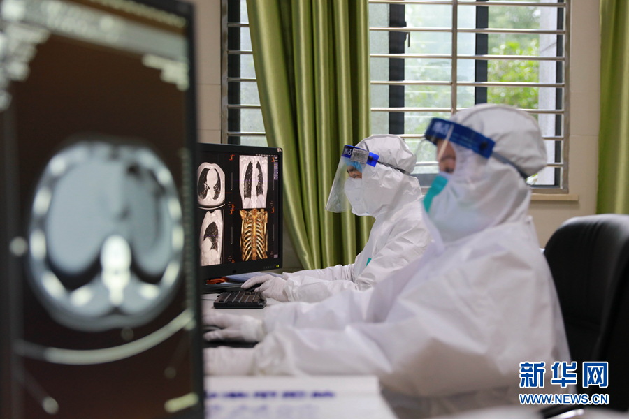 2月26日,湖北省榮軍醫(yī)院放射科主任龔文松(左)、肖顏查看病人CT結(jié)果。 新華社發(fā)(朱玲玲 攝)