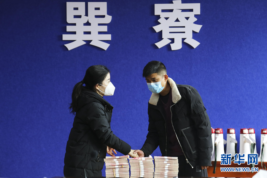 1月28日,90后退役軍人蘇培賓(右)向廣東惠東巽寮管委會(huì)捐款30萬(wàn)元助力家鄉(xiāng)疫情防控。 新華社發(fā)