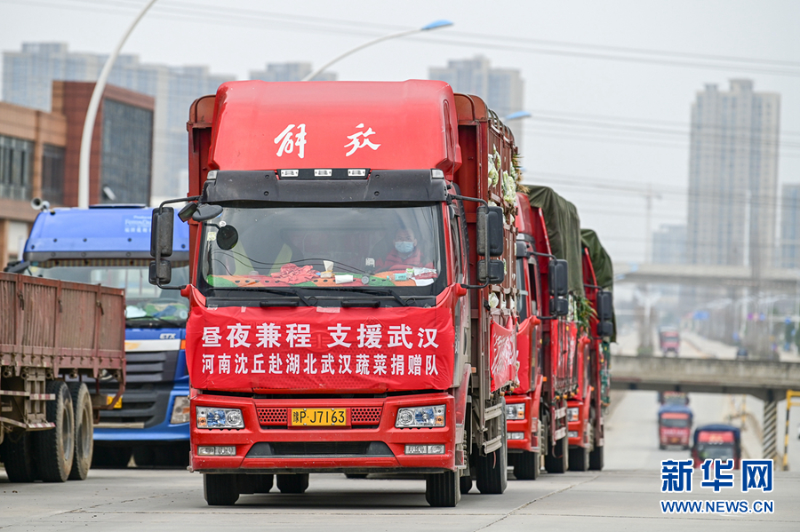 3月1日,河南沈丘退伍老兵王國(guó)輝帶隊(duì)第三次來(lái)到武漢送菜,將沈丘縣委縣政府采購(gòu)的130噸農(nóng)副產(chǎn)品捐贈(zèng)給武漢。 新華社發(fā)(侯建勛 攝)