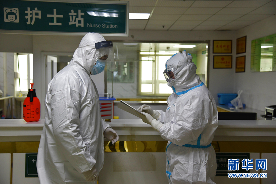 2月13日,湖北省榮軍醫(yī)院黃海明醫(yī)生(左)與退役軍人事務(wù)系統(tǒng)援助湖北醫(yī)療隊(duì)隊(duì)員、江西省榮軍醫(yī)院醫(yī)生、退役軍人晏鑫鵬做工作交接。 新華社發(fā)(朱玲玲 攝)
