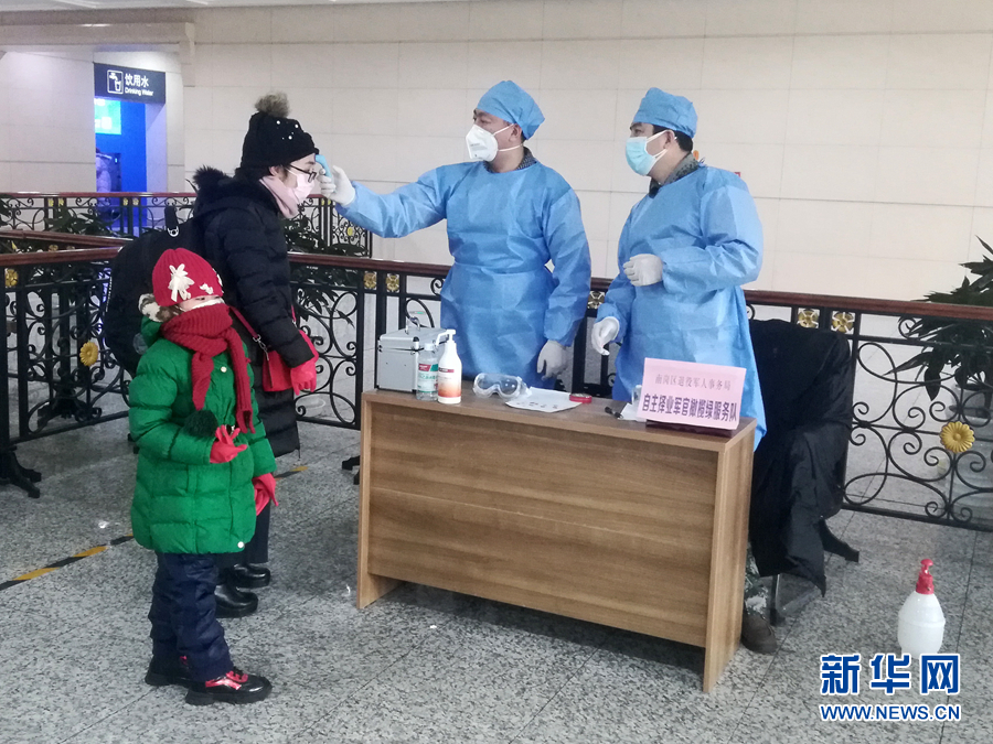 2月14日,黑龍江哈爾濱68名自主擇業(yè)軍轉(zhuǎn)干部組成的“橄欖綠疫情防控志愿服務(wù)隊(duì)”隊(duì)員在火車(chē)站為旅客測(cè)量體溫。 新華社發(fā)(韓振忠 攝)