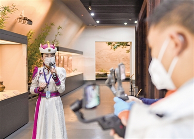 2020年3月7日,內(nèi)蒙古呼和浩特市昭君博物院金牌講解員在進(jìn)行5G文旅直播,讓公眾足不出戶感受“單于和親”“昭君出塞”的歷史文化魅力。丁根厚攝/光明圖片