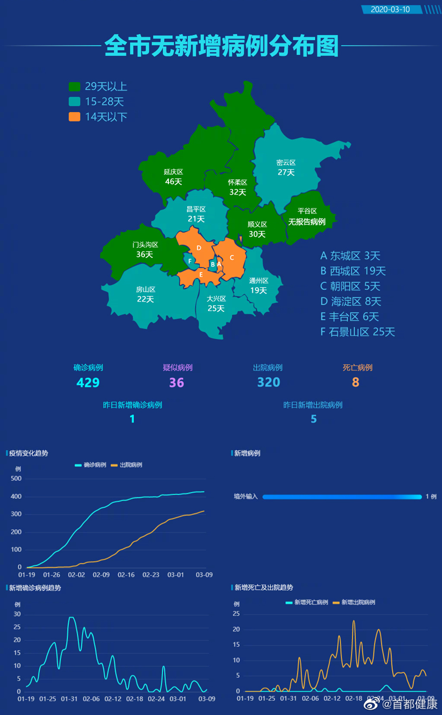 截至3月9日24時,累計(jì)確診病例429例,治愈出院病例320例,死亡病例8例。現(xiàn)有疑似病例36例。累計(jì)確定密切接觸者3650人,其中467人尚在隔離醫(yī)學(xué)觀察中。確診病例中東城區(qū)14例、西城區(qū)53例、朝陽區(qū)72例、海淀區(qū)63例、豐臺區(qū)43例、石景山區(qū)14例、門頭溝3例、房山區(qū)16例、通州區(qū)19例、順義區(qū)10例、昌平區(qū)29例、大興區(qū)39例、懷柔區(qū)7例、密云區(qū)7例、延慶區(qū)1例,平谷區(qū)尚未有病例,外地來京病例25例,境外輸入病例14例。