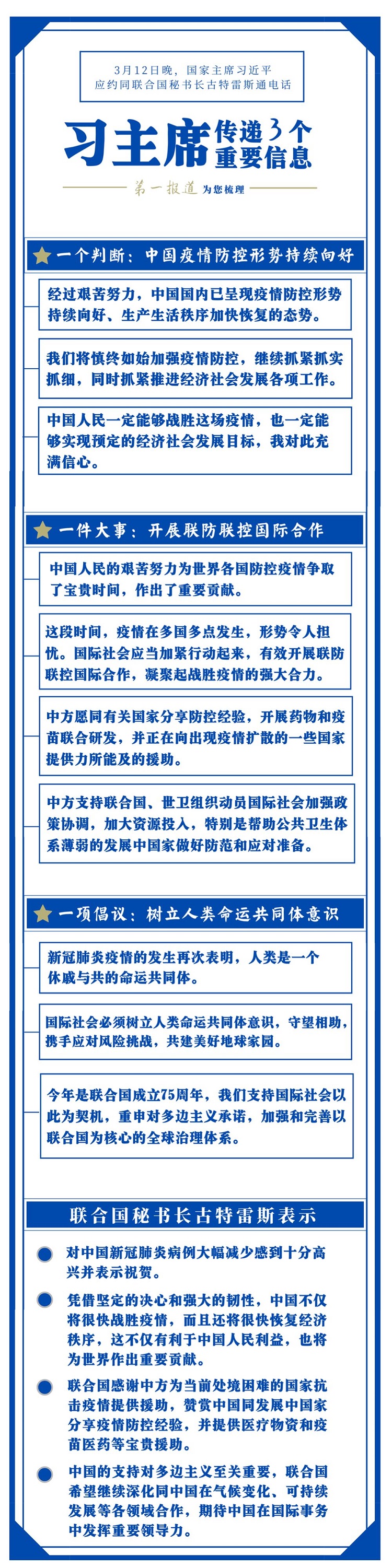對(duì)疫情防控國際合作這件大事,習(xí)主席一直十分關(guān)心。此前,在內(nèi)外事活動(dòng)中,他曾多次提及。這一次同古特雷斯通電話,習(xí)主席有更明確闡述。