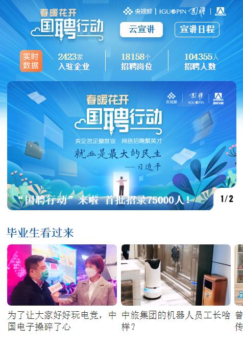 用戶只需下載“央視頻”客戶端并進(jìn)入“國聘行動”專題頁面,即可通過滑動掌握近2500家入駐企業(yè)的招聘信息。并可通過在線簡歷投遞等方式,直通企業(yè)人力部門,實現(xiàn)全流程“無接觸”應(yīng)聘。