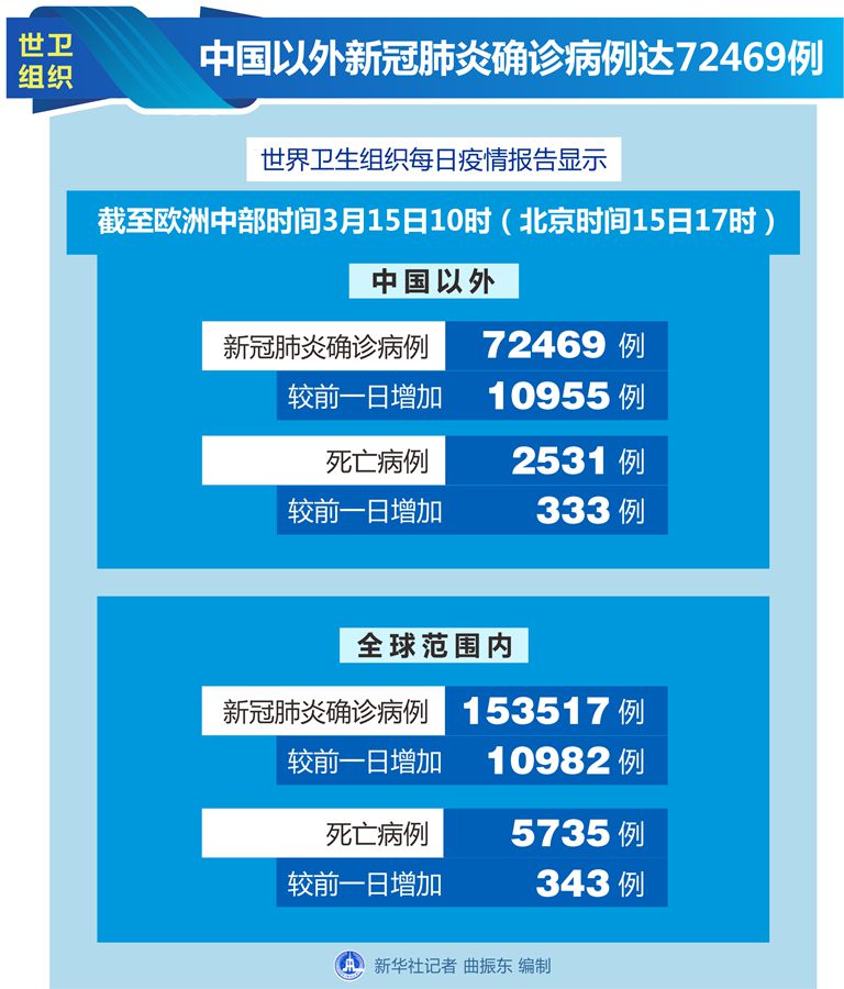 世衛(wèi)組織每日疫情報(bào)告顯示,截至歐洲中部時(shí)間15日10時(shí)(北京時(shí)間15日17時(shí)),中國以外新冠肺炎確診病例較前一日增加10955例,達(dá)到72469例;中國以外死亡病例較前一日增加333例,達(dá)到2531例。