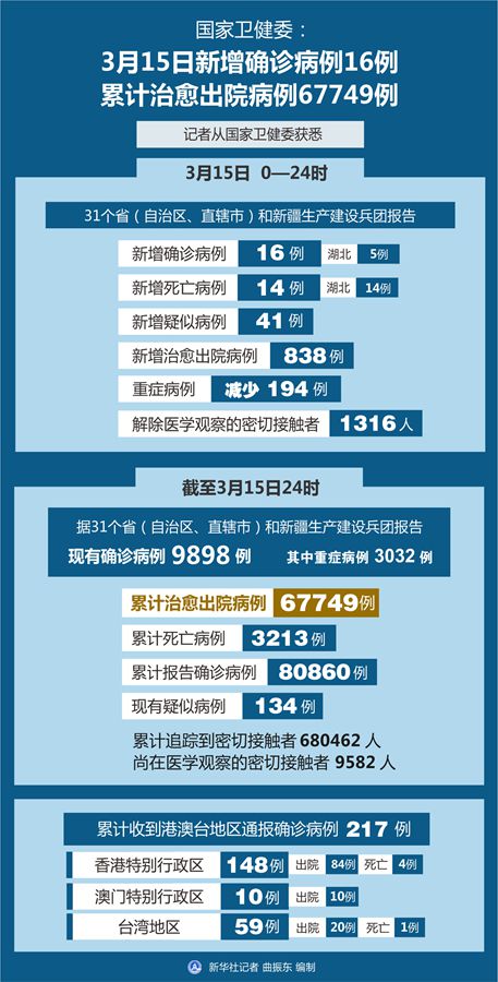 截至3月15日24時,據(jù)31個?。ㄗ灾螀^(qū)、直轄市)和新疆生產(chǎn)建設(shè)兵團報告,現(xiàn)有確診病例9898例(其中重癥病例3032例),累計治愈出院病例67749例,累計死亡病例3213例,累計報告確診病例80860例,現(xiàn)有疑似病例134例。累計追蹤到密切接觸者680462人,尚在醫(yī)學(xué)觀察的密切接觸者9582人。