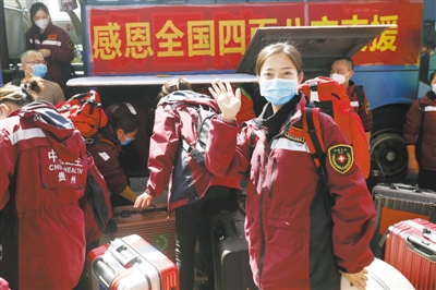 3月17日,支援湖北的部分貴州醫(yī)療隊員和湖南醫(yī)療隊員從武漢火車站乘坐高鐵離開。圖為貴州醫(yī)療隊員向歡送的人們揮手致意。新華社記者 沈伯韓攝