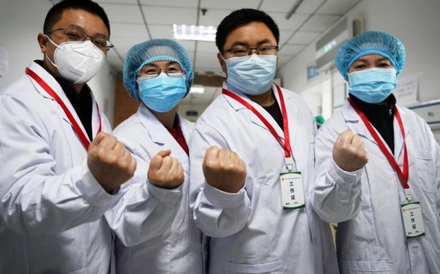 圖為四川大學(xué)華西醫(yī)院援湖北醫(yī)療隊(duì)朱仕超(右二)與同事相互鼓勵(lì)打氣。