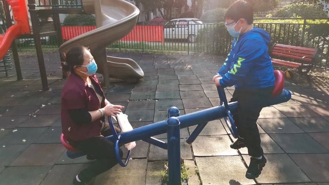 雖然開心,但是居民的防疫措施可一點都沒有松懈,帶著孩子出來玩兒蹺蹺板的媽媽還隨身攜帶了酒精噴霧做消殺。