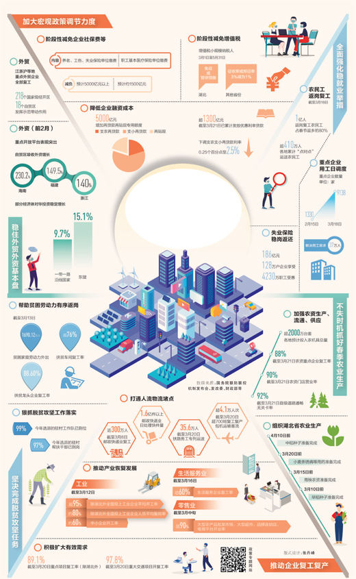 一個(gè)月以來(lái),各地各部門(mén)分區(qū)分級(jí)精準(zhǔn)復(fù)工復(fù)產(chǎn),圍繞中小微企業(yè)、農(nóng)民工、高校畢業(yè)生、外商等出臺(tái)針對(duì)性措施,加大支持力度。本版推出數(shù)據(jù)可視化融媒體報(bào)道,展現(xiàn)生產(chǎn)生活秩序加快恢復(fù)的態(tài)勢(shì)和積極成效。
