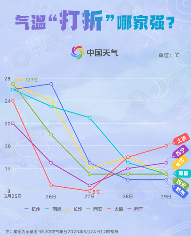 27日,南方大部也將加入降溫的行列,單日降溫幅度沒有北方劇烈,在6-8℃左右,但是累積降溫幅度大,27日開始的兩三天內(nèi),部分地區(qū)也將超過10℃。城市中,杭州最高氣溫累計(jì)降幅可達(dá)17℃、南昌降16℃、長沙降15℃、貴陽降14℃、上海降13℃,最高氣溫紛紛降至10℃出頭。29日,江淮、江漢和江南大部最低氣溫也僅有4~9℃。