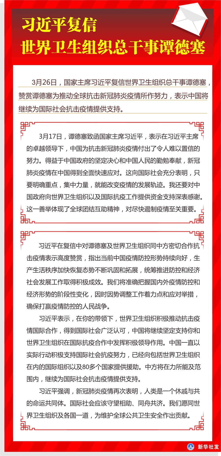 新華社北京3月26日電 3月26日,國家主席習近平復信世界衛(wèi)生組織總干事譚德塞,贊賞譚德塞為推動全球抗擊新冠肺炎疫情所作努力,表示中國將繼續(xù)為國際社會抗擊疫情提供支持。