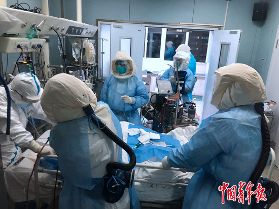 3月9日,在金銀潭南樓的重癥ICU病房內(nèi),醫(yī)護人員正在對一名呼吸困難的新冠肺炎患者進行纖支鏡手術(shù)。