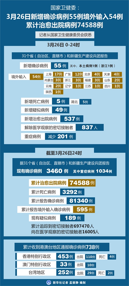新華社北京3月27日電(記者齊中熙、張泉)記者27日從國家衛(wèi)生健康委員會(huì)獲悉,3月26日0—24時(shí),31個(gè)省(自治區(qū)、直轄市)和新疆生產(chǎn)建設(shè)兵團(tuán)報(bào)告新增確診病例55例,其中境外輸入病例54例,本土病例1例(浙江1例);新增死亡病例5例(湖北5例);新增疑似病例49例。