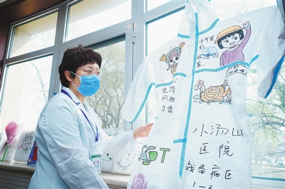 醫(yī)護(hù)人員展示防護(hù)服上的涂鴉作品。為減輕待篩查人員緊張心理,幫助確診患者樹立戰(zhàn)勝疾病的信心,醫(yī)院在籌建之初,就將心理干預(yù)納入其中,發(fā)起組織病區(qū)環(huán)境布置、背包設(shè)計(jì)、折紙比賽、八段錦訓(xùn)練等活動(dòng),營造“家”的氛圍。記者 賀 勇攝