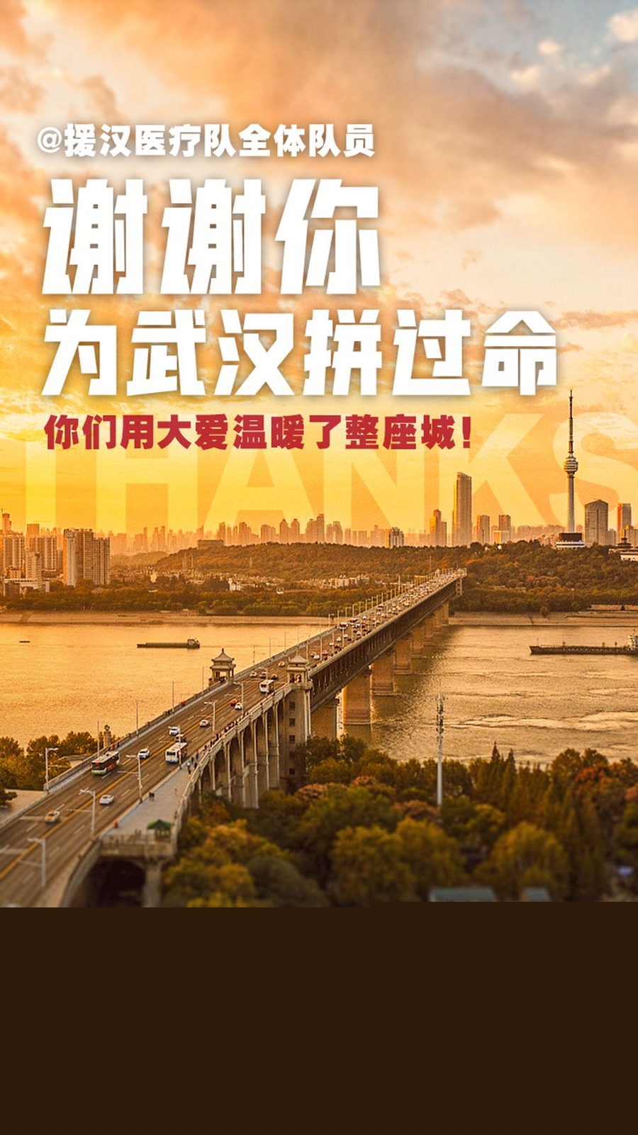 患難相扶,生死與共。在這幾十天里,你們與武漢人民心手相連、生死相依,從死神手中搶回了一條條生命、拯救了一個(gè)個(gè)家庭。忘不了你們從祖國(guó)四面八方馳援武漢時(shí),口中喊出的“武漢加油!中國(guó)加油!”;忘不了你們穿著防護(hù)裝備走進(jìn)病房,握著患者的手說(shuō)“別怕,有我們?cè)?!”;忘不了你們臉上被面罩勒出的一道道印痕;更忘不了你們摘掉口罩后露出美麗迷人的笑容!“沒(méi)有生而英勇,只是選擇無(wú)畏”,感謝你們?cè)谖錆h人民遭遇疫情的困難時(shí)刻,迎難而上、沖鋒在前,以命搏命、舍命相助,用大愛(ài)溫暖了整座城!因?yàn)槟銈兊牡絹?lái),武漢更多患者得到了及時(shí)有效的救治;因?yàn)槟銈兊牡絹?lái),武漢才這么快地迎來(lái)了疫情防控斗爭(zhēng)的勝利曙光;因?yàn)槟銈兊牡絹?lái),武漢才有了今天的穩(wěn)定和安寧。你們是最大的功臣!是新時(shí)代最可愛(ài)的人!武漢人民永遠(yuǎn)銘記你們的恩情!