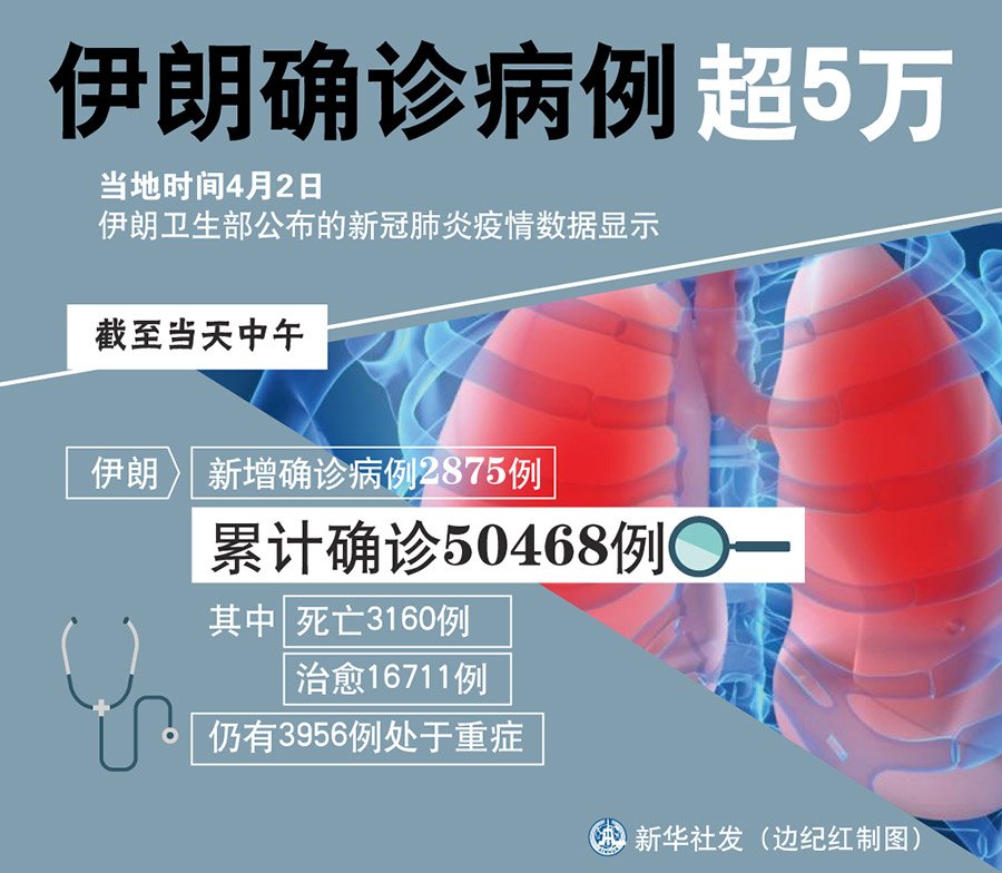 新華社德黑蘭4月2日電(記者陳霖)伊朗衛(wèi)生部2日公布的新冠肺炎疫情數(shù)據(jù)顯示,截至當天中午,伊朗新增確診病例2875例,累計確診50468例,其中死亡3160例,治愈16711例,仍有3956例處于重癥。