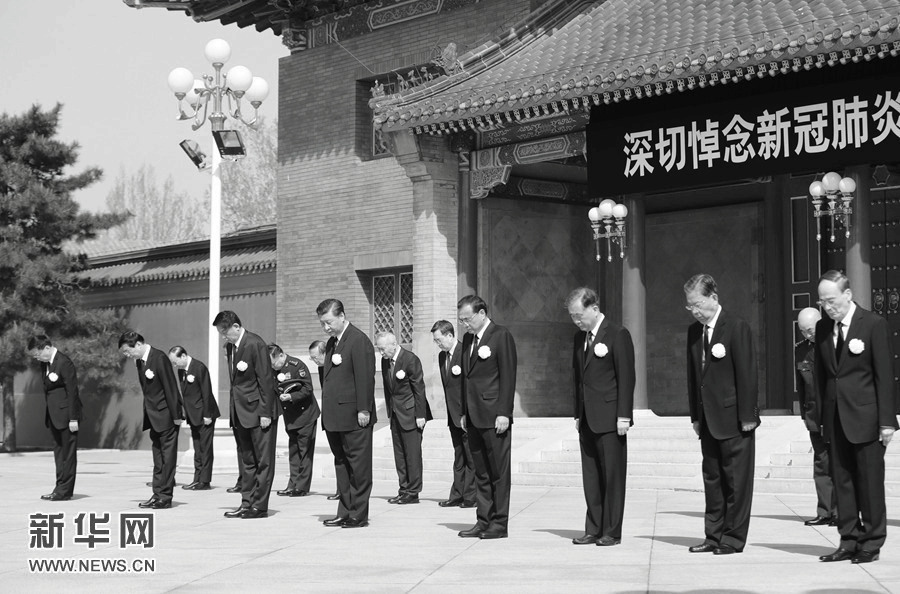 4月4日上午10時(shí),習(xí)近平、李克強(qiáng)、栗戰(zhàn)書(shū)、汪洋、王滬寧、趙樂(lè)際、韓正、王岐山等黨和國(guó)家領(lǐng)導(dǎo)人在中南海懷仁堂前,同全國(guó)各地各族人民一起,向抗擊新冠肺炎疫情斗爭(zhēng)犧牲烈士和逝世同胞默哀。 新華社記者 龐興雷 攝