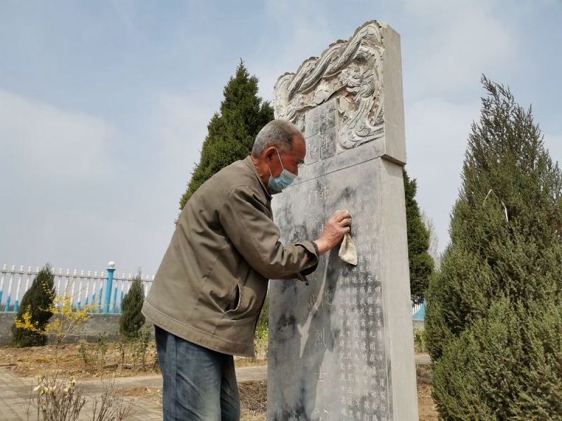 4月2日,苗明文在“八路墳”仔細(xì)擦拭烈士碑。新華社記者 杜一方 攝