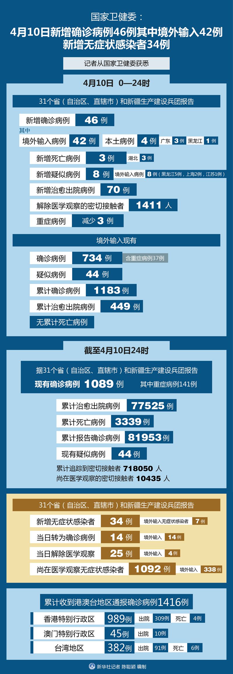 截至4月10日24時(shí),據(jù)31個(gè)省(自治區(qū)、直轄市)和新疆生產(chǎn)建設(shè)兵團(tuán)報(bào)告,現(xiàn)有確診病例1089例(其中重癥病例141例),累計(jì)治愈出院病例77525例,累計(jì)死亡病例3339例,累計(jì)報(bào)告確診病例81953例,現(xiàn)有疑似病例44例。累計(jì)追蹤到密切接觸者718050人,尚在醫(yī)學(xué)觀察的密切接觸者10435人。