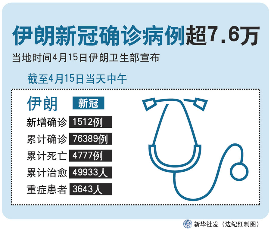 新華社德黑蘭4月15日電(記者陳霖)伊朗衛(wèi)生部15日宣布,截至當(dāng)天中午,伊朗新增新冠確診病例1512例,累計(jì)確診達(dá)76389例,累計(jì)死亡病例4777例,累計(jì)治愈49933人,目前尚有重癥患者3643人。