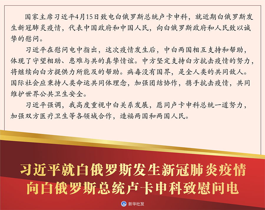 新華社北京4月17日電? 國家主席習(xí)近平4月15日致電白俄羅斯總統(tǒng)盧卡申科,就近期白俄羅斯發(fā)生新冠肺炎疫情,代表中國政府和中國人民,向白俄羅斯政府和人民致以誠摯的慰問。