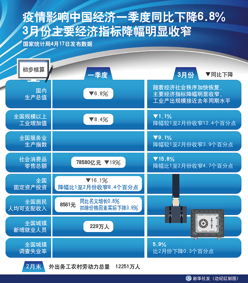 新華社北京4月17日電(記者陳煒偉、安蓓)國家統(tǒng)計(jì)局17日發(fā)布數(shù)據(jù),初步核算,一季度國內(nèi)生產(chǎn)總值同比下降6.8%。3月份,隨著經(jīng)濟(jì)社會秩序加快恢復(fù),主要經(jīng)濟(jì)指標(biāo)降幅明顯收窄,工業(yè)產(chǎn)出規(guī)模接近去年同期水平。