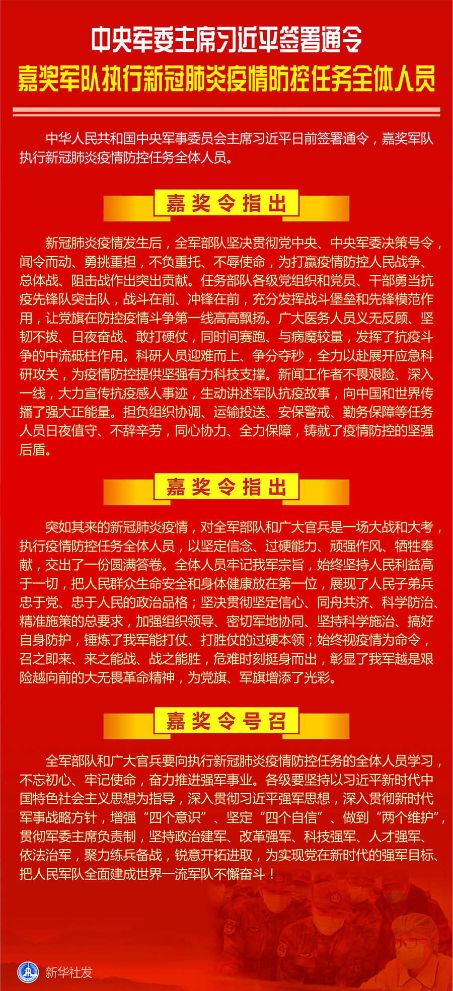 嘉獎(jiǎng)令指出,突如其來的新冠肺炎疫情,對全軍部隊(duì)和廣大官兵是一場大戰(zhàn)和大考,執(zhí)行疫情防控任務(wù)全體人員,以堅(jiān)定信念、過硬能力、頑強(qiáng)作風(fēng)、犧牲奉獻(xiàn),交出了一份圓滿答卷。全體人員牢記我軍宗旨,始終堅(jiān)持人民利益高于一切,把人民群眾生命安全和身體健康放在第一位,展現(xiàn)了人民子弟兵忠于黨、忠于人民的政治品格;堅(jiān)決貫徹堅(jiān)定信心、同舟共濟(jì)、科學(xué)防治、精準(zhǔn)施策的總要求,加強(qiáng)組織領(lǐng)導(dǎo)、密切軍地協(xié)同、堅(jiān)持科學(xué)施治、搞好自身防護(hù),錘煉了我軍能打仗、打勝仗的過硬本領(lǐng);始終視疫情為命令,召之即來、來之能戰(zhàn)、戰(zhàn)之能勝,危難時(shí)刻挺身而出,彰顯了我軍越是艱險(xiǎn)越向前的大無畏革命精神,為黨旗、軍旗增添了光彩。