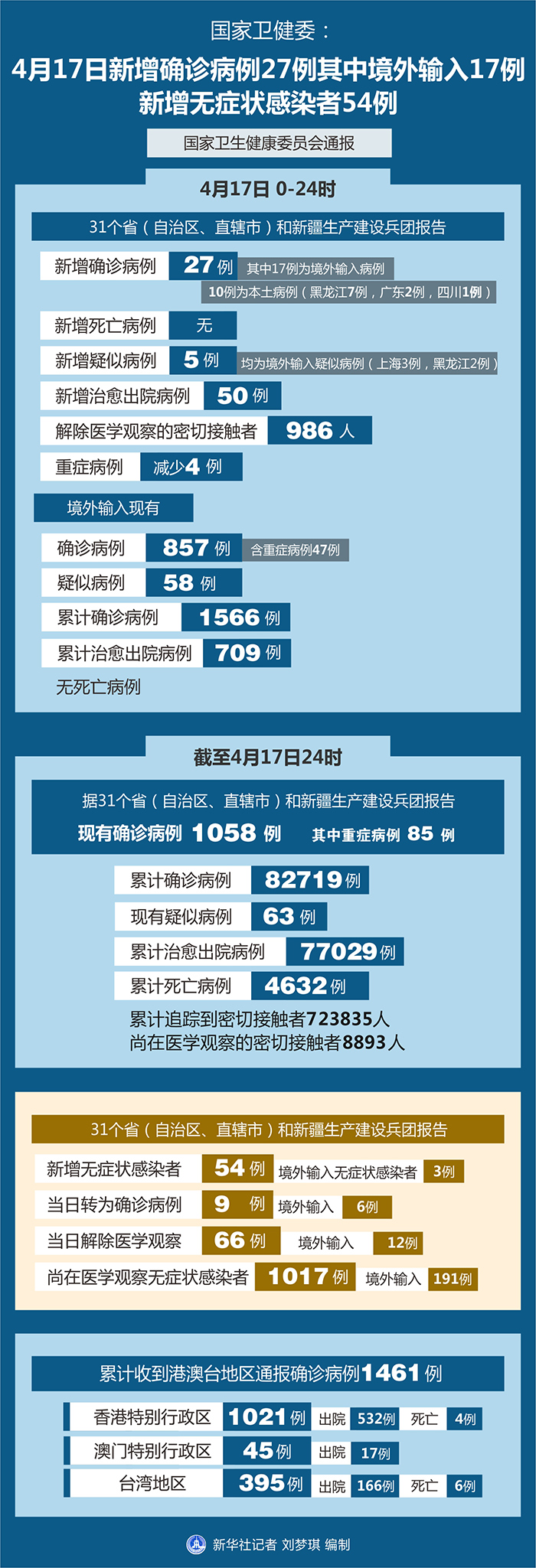 截至4月17日24時,據(jù)31個?。ㄗ灾螀^(qū)、直轄市)和新疆生產(chǎn)建設兵團報告,現(xiàn)有確診病例1058例(其中重癥病例85例),累計治愈出院病例77029例,累計死亡病例4632例,累計報告確診病例82719例,現(xiàn)有疑似病例63例。累計追蹤到密切接觸者723835人,尚在醫(yī)學觀察的密切接觸者8893人。