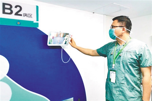 原慶通過可視系統(tǒng)與患者病房對(duì)話。余易安攝(中經(jīng)視覺)