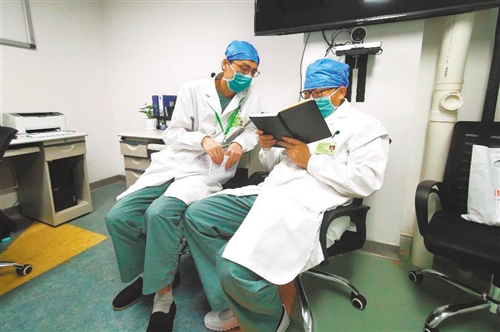 原慶(右)在醫(yī)生辦公室與同事交接班。余易安攝(中經(jīng)視覺)