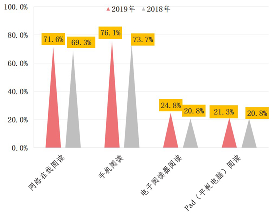 具體來看,2019年有76.1%的成年國(guó)民進(jìn)行過手機(jī)閱讀,71.6%的成年國(guó)民進(jìn)行過網(wǎng)絡(luò)在線閱讀,24.8%的成年國(guó)民在電子閱讀器上閱讀,21.3%的成年國(guó)民使用Pad(平板電腦)進(jìn)行數(shù)字化閱讀,均較2018年有所上升。