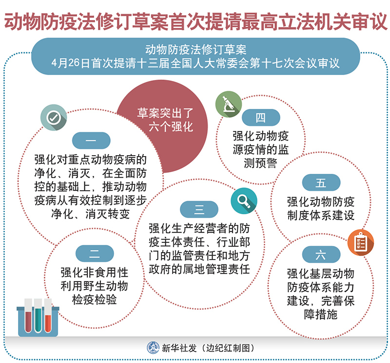 新華社北京4月26日電(記者胡璐)動物防疫法修訂草案26日首次提請十三屆全國人大常委會第十七次會議審議。草案按照全面提升動物衛(wèi)生水平的目標(biāo),對動物防疫方針、防疫責(zé)任體系、制度體系、監(jiān)管體系等調(diào)整完善,構(gòu)建科學(xué)、合理、健全的動物防疫法律制度。